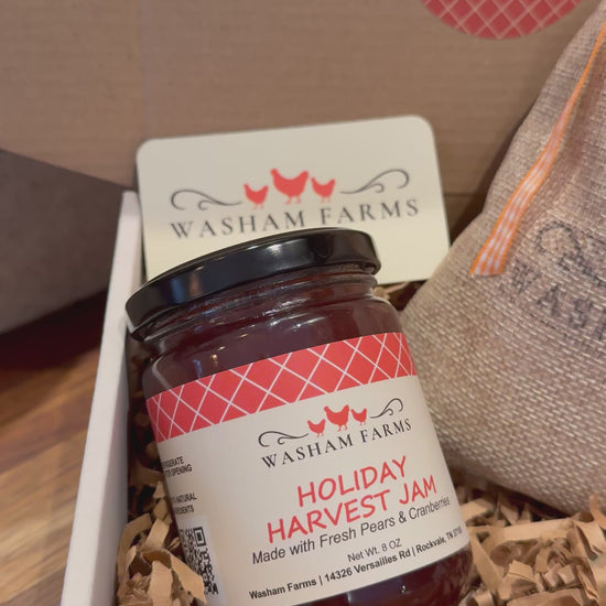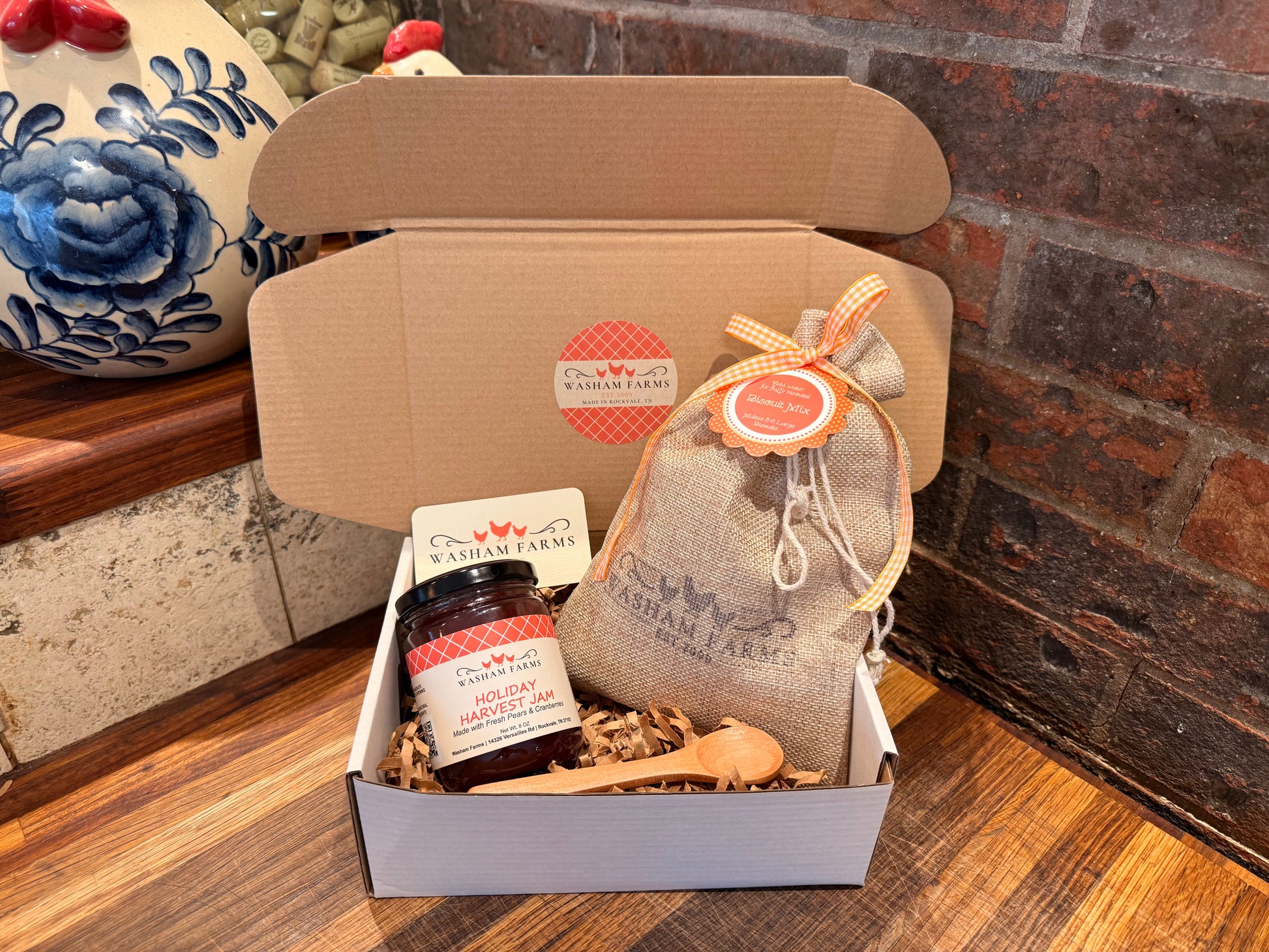 Each set contains homemade biscuit mix, 12oz Fruit Jelly, and a wooden spoon.